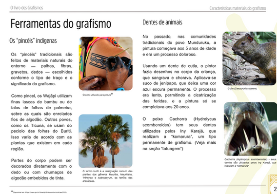 📗 Volume 2 (70 págs.) – Material didático completo para professores, com 6 sequências didáticas prontas, cartelas para impressão (padrões gráficos, pigmentos, cestos, cerâmicas, tatuagens), além de recursos complementares como infográficos e videoteca de pinturas indígenas.